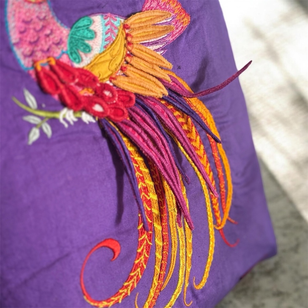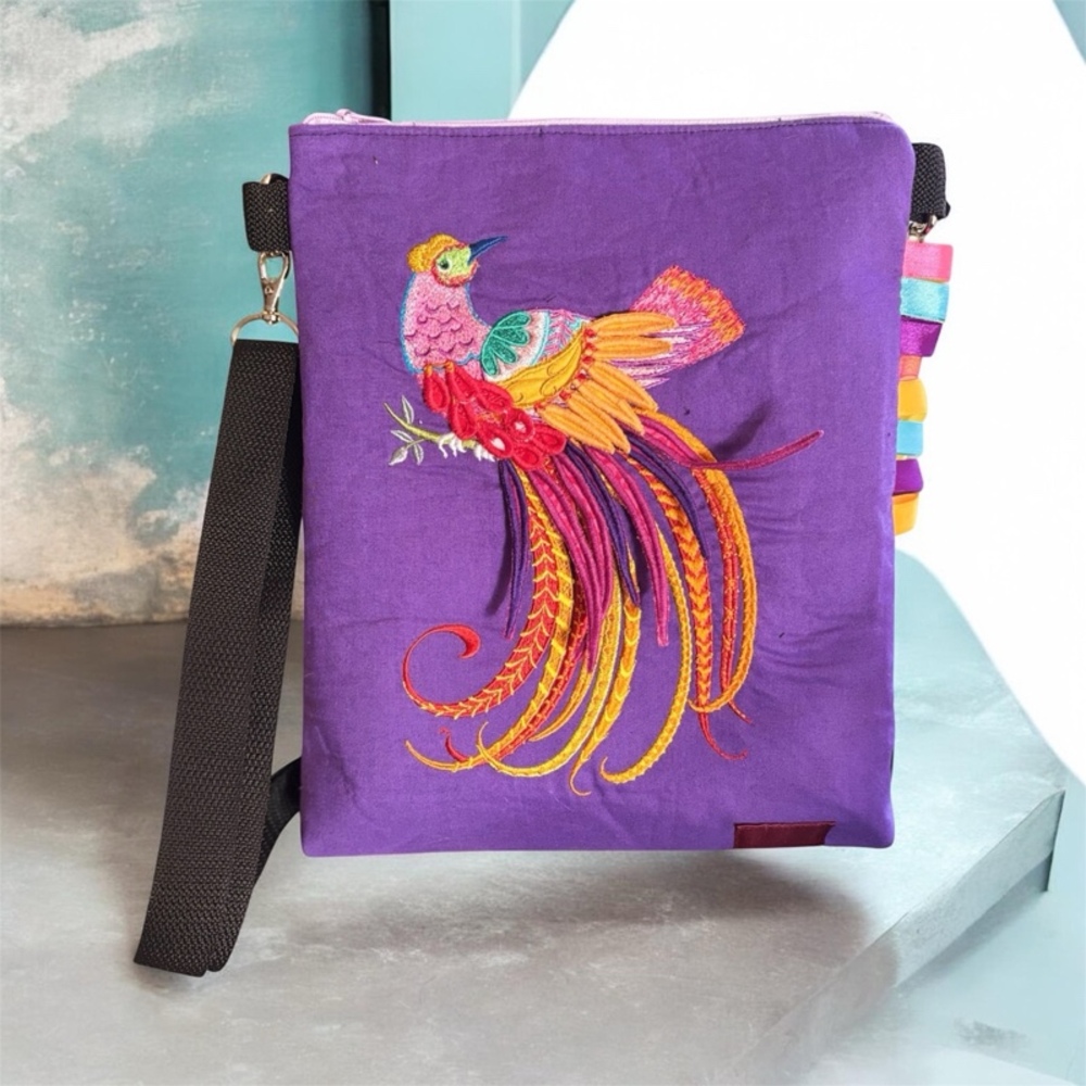 Příběh tohoto kousku:"Někdy k tomu, abyste zazářili, nepotřebujete světlo zvenčí, stačí probudit oheň ve svém nitru. Tato kabelka vypráví legendu o bájném ptáku Ohniváku, který přináší světlo do tmy a naději tam, kde už vyhasla. Jeho peří, vyvedené v zářivých nitích, jako by se hýbalo s každým vaším krokem. Je to kousek pro ženy, které věří na pohádky, milují mystiku fialové barvy a chtějí doplněk, který je stejně jedinečný a nespoutaný jako jejich sny. Staňte se nositelkou příběhu, který ožívá pod vašima rukama."Vlastnosti a detaily: