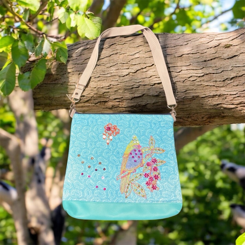 "Představte si ráno, kdy vás probudí koncert v korunách stromů. Tato kabelka vypráví příběh o barevných ptáčcích, kteří si pro svůj domov vybrali tu nejzářivější zahradu. Je to oslava přírody, vrstvení materiálů a radosti z detailu. Každá strana kabelky odkrývá jinou část tohoto ptačího příběhu, takže vás i vaše okolí bude bavit pokaždé, když ji přehodíte přes rameno."Vlastnosti a detaily: