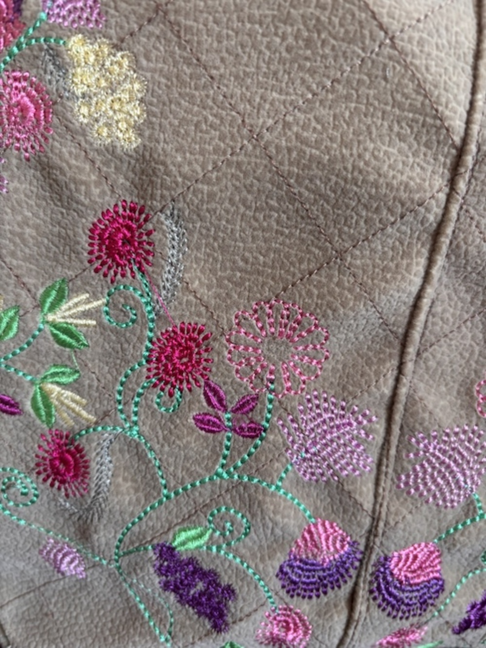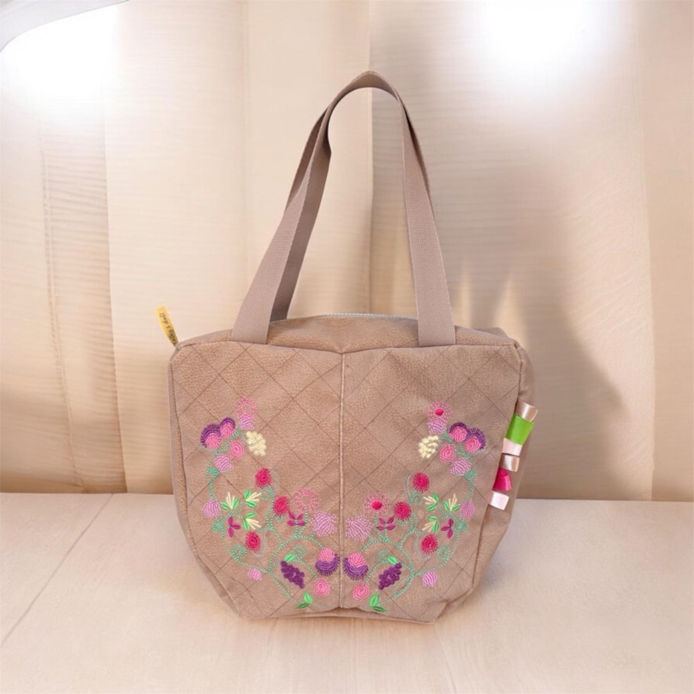 Příběh tohoto kousku:"Někdy i ta nejobyčejnější cesta do města může být procházkou v zahradě. Tato kabelka vypráví příběh o spojení tradice a moderního rytmu života. Pevná a odolná látka, která obvykle chrání naše domovy, se zde stala plátnem pro pestrobarevnou výšivku plnou květů. Je to kousek pro ženy, které milují poctivé materiály, nespoutané barvy a chtějí doplněk, který vydrží roky, aniž by ztratil na své kráse. Kousek pro ty, které věří, že praktičnost a umění patří k sobě."Vlastnosti a detaily: