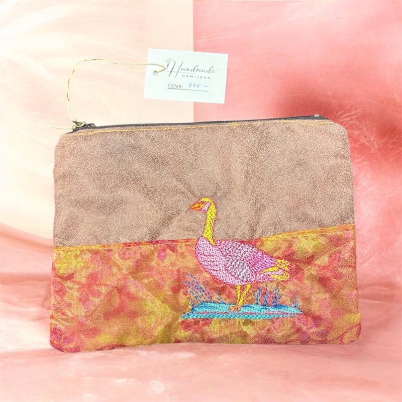 "Někdy i ta nejobyčejnější procházka k rybníku může vypadat jako scéna ze starého obrazu. Tato kapsička vypráví příběh o růžové huse, která se hrdě nese na hladině, zatímco kolem ní září barvy podzimního slunce. Je to kousek pro ženy, které milují bohaté textury, zemité tóny a chtějí mít u sebe doplněk, který v sobě nese klidnou eleganci i špetku pohádkového snění."Vlastnosti a detaily: