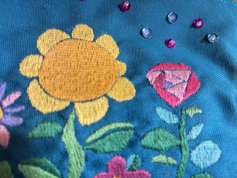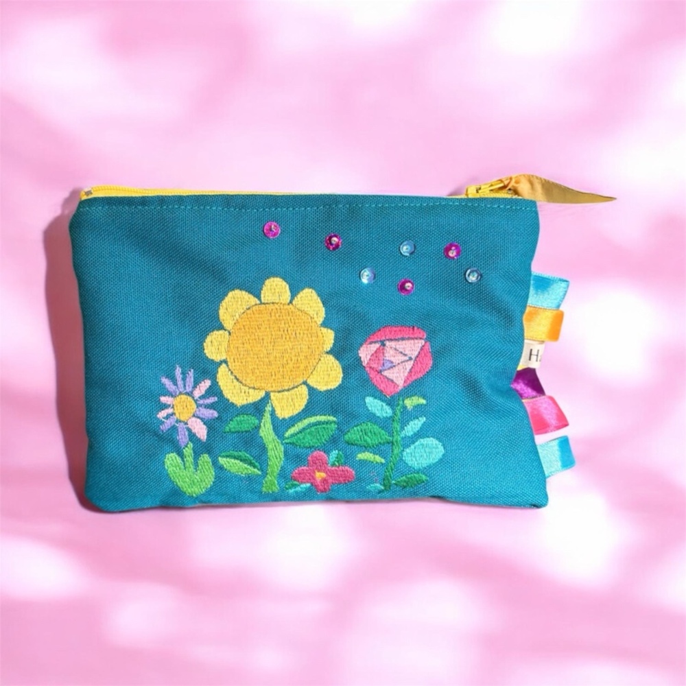 - Design: Dominantou je bohatá vícebarevná výšivka slunečnice a květin, která je ručně dozdobena originálními flitry pro luxusní třpytivý efekt. Barevná poutka na boku dodávají taštičce hravý charakter.