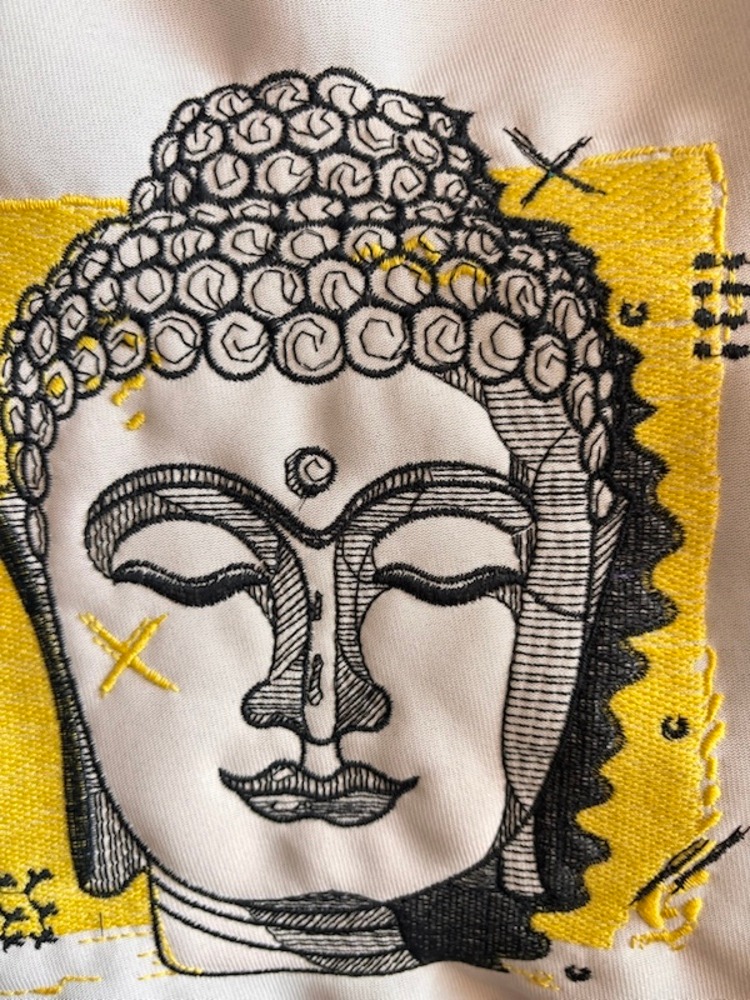 - Materiál a design: Kombinace vysoce odolné šedé potahové látky s pevnou strukturou a hladkého panelu s autorskou výšivkou. Motiv Buddhy v pop-art stylu s výraznými černými konturami na zářivě žlutém podkladu.