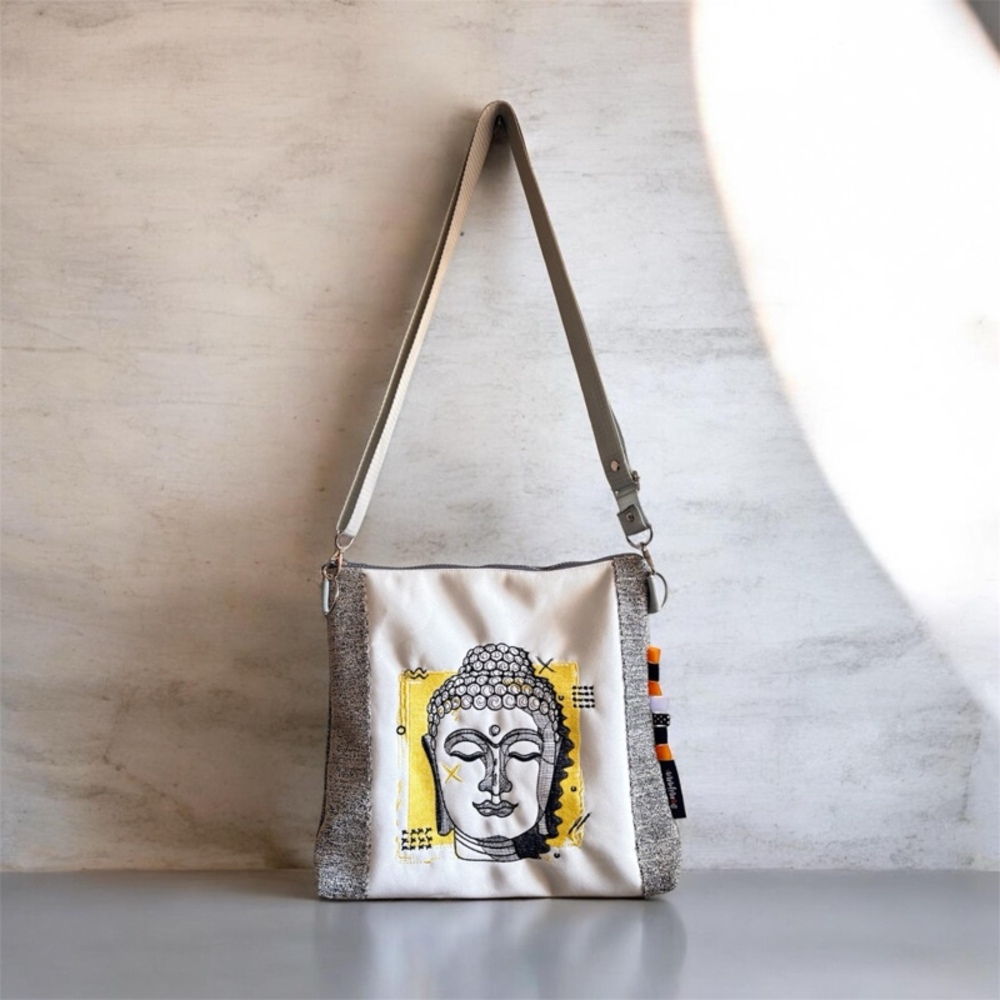 "Najít klid uprostřed městského shonu je umění. Tato kabelka je připomínkou, že svůj vnitřní střed si nosíte stále s sebou. Spojuje v sobě syrovost šedé strukturované látky s energickým pop-artovým ztvárněním Buddhy. Je to kousek pro moderní rebelky i hledající duše, které chtějí vyjádřit svůj názor beze slov. Styl, který nespěchá, ale přesto vyčnívá z davu."